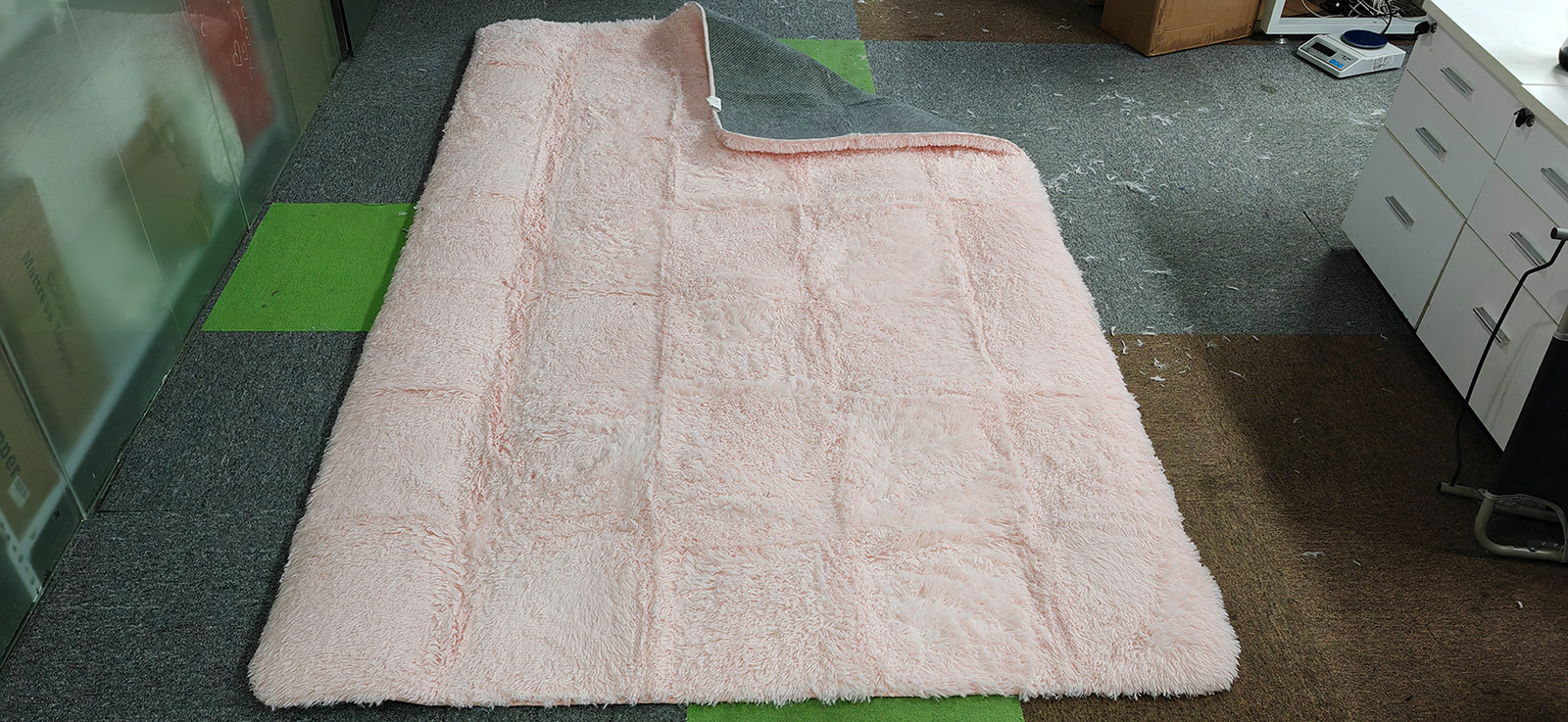 Soft Fluffy Area Rugs,” the letter “T,” “100% Polyester,” “High-density